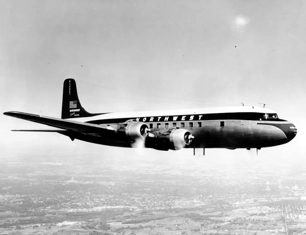 Feb. 10 — The Douglas DC-6B, a lengthened passenger version of the DC-6A and DC-6C cargo aircraft, makes its first flight. This 32-meter-long variant, which proves to be one of the most successful piston-engine transports ever built, can seat up to 102 passengers and has a range of 2,610 nautical miles (4,830 kilometers). Douglas produces nearly 300 before ending DC-6 production in 1958. Kenneth Munson, Airliners Since 1946, pp. 123-124.