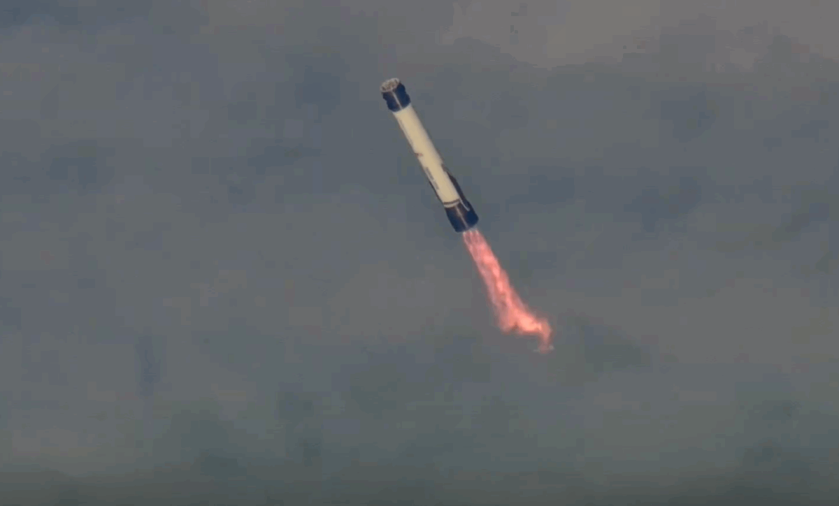 The 98-meter-tall rocket lifted off at 3:55 p.m. Eastern from Launch Complex 36 at Cape Canaveral Space Force Station into a mostly sunny autumn sky, with bright blue and red flames streaming from the booster’s seven BE-4 engines. The booster separated from the second stage about 4 minutes later, fell back toward Earth and ignited its engines to slow its descent. Smoke obscured the barge as the booster approached, then cleared to show it standing intact and upright.