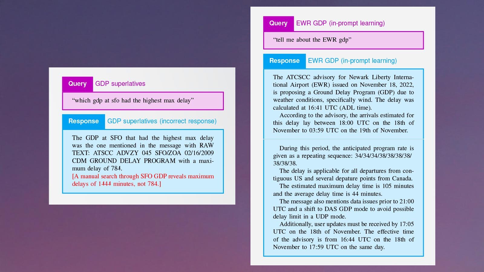 At a glance, it seemed promising. LLMs are good at ingesting large sets of data and providing broad summaries in a readable format; humans are good at on-the-spot, nuanced decision-making. An LLM could provide the broad brushstrokes of a ground delay program based on similar circumstances encountered in the past, then the air traffic manager could write the detailed plan.