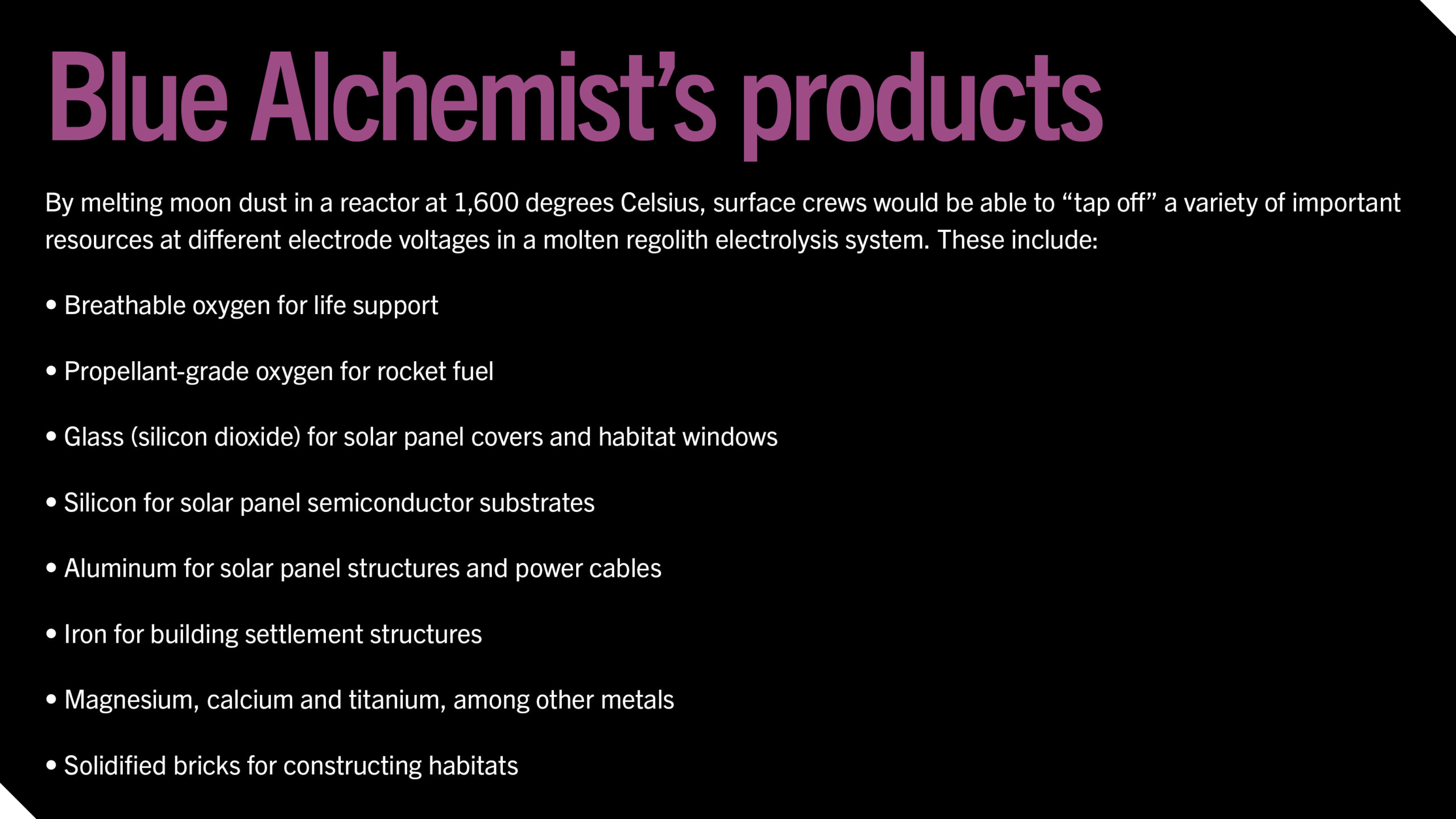 If all goes as planned, Blue Alchemist will take moon dust in and push out products like solar cells, cables, air and fuel — all in one-sixth of Earth’s gravity, in a vacuum, and on a celestial body with punishing temperatures fluctuating between 120 degrees and minus 133 degrees Celsius.