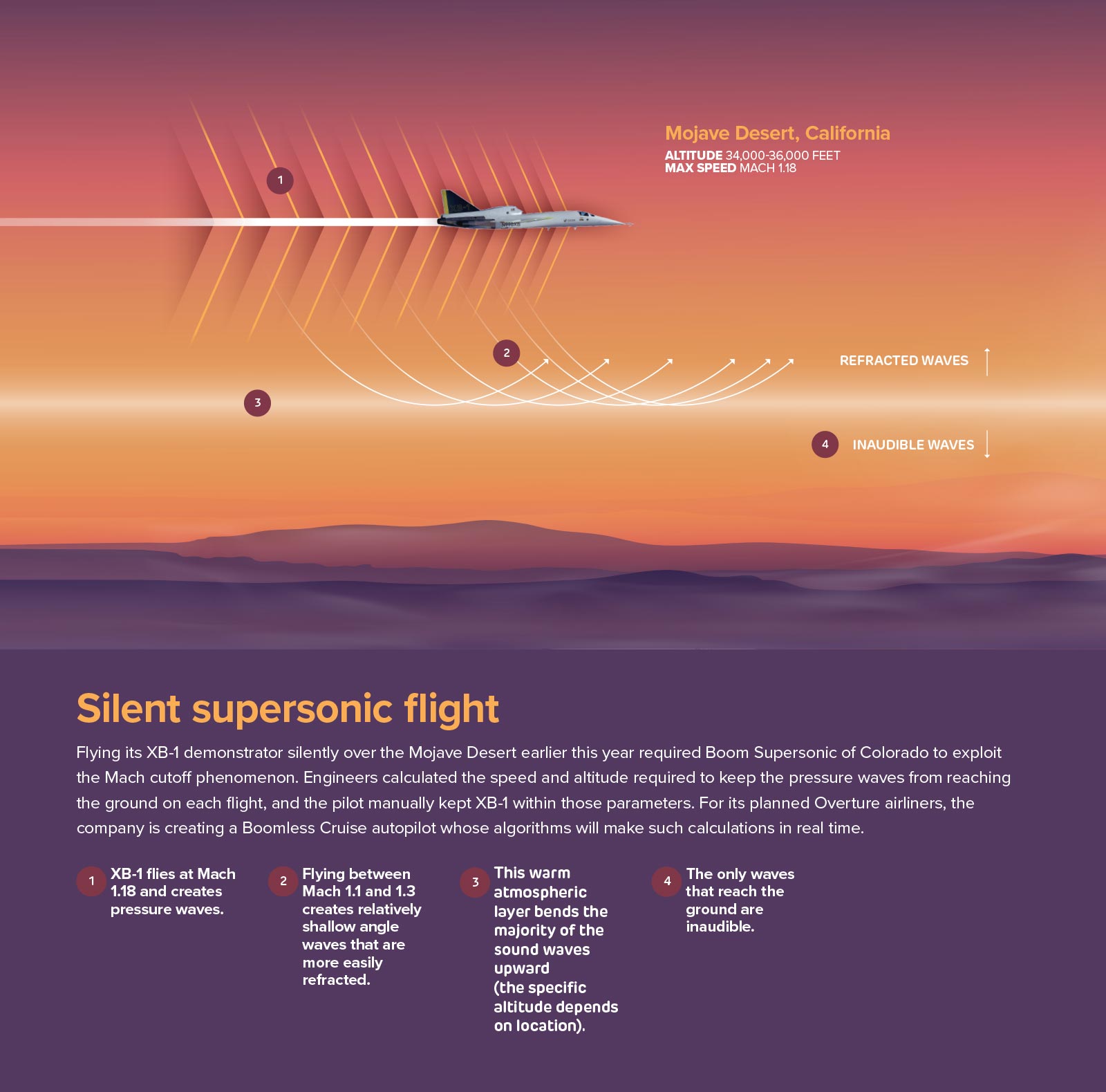 The XB-1 demonstrator doesn’t have autopilot, so Boom engineers had to calculate ahead of time the required altitude and speed to achieve quiet supersonic flight over the desert. This isn’t practical for Overtures taking off and flying all over the world, and so Boomless Cruise was born.