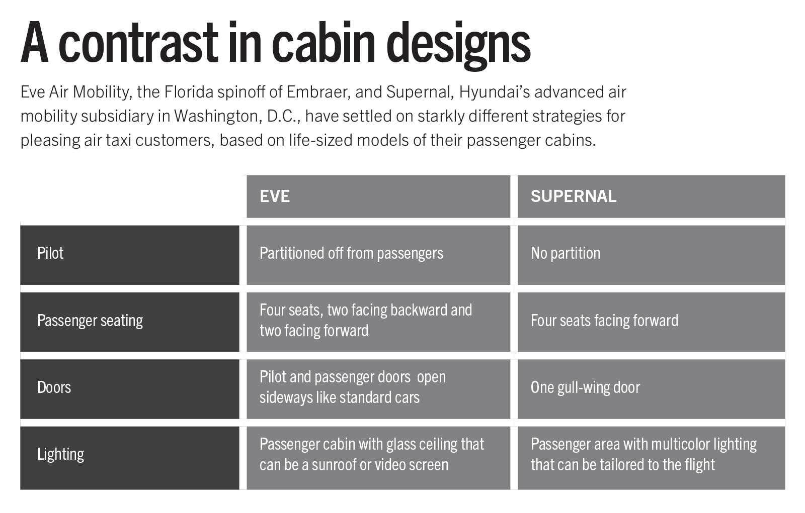 FARNBOROUGH AIRSHOW, Farnborough, U.K. — While the latest business jets, airliners and warplanes flew back and forth in excessive heat even for summertime on Monday, here in the fully air-conditioned exhibit hall, executives from Supernal, Hyundai’s advanced air mobility company, showed off the cabin design of the company’s planned electric aircraft.