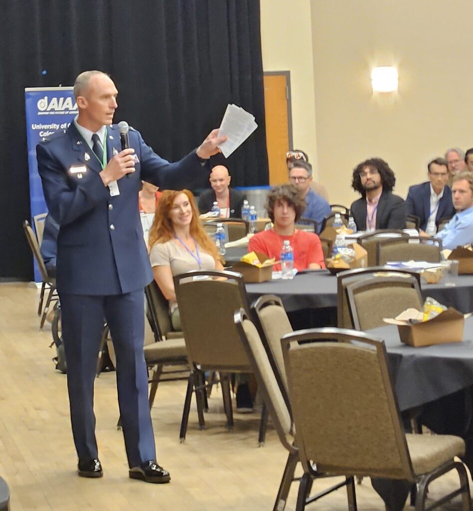 Throughout the day, speakers and presenters underscored the value of bringing together thought leaders, students, researchers, and enthusiasts in a shared forum to foster in-depth discussion and community building. Chris Vigil, chair of the AIAA Rocky Mountain Section and one of the event organizers began by telling the crowd, “Some of the most brilliant minds in aerospace and astronautics are together in this room. And there are also people here who are aspiring to achieve that someday. So, make new connections and strengthen existing relationships… Today, be sure you lean in.”