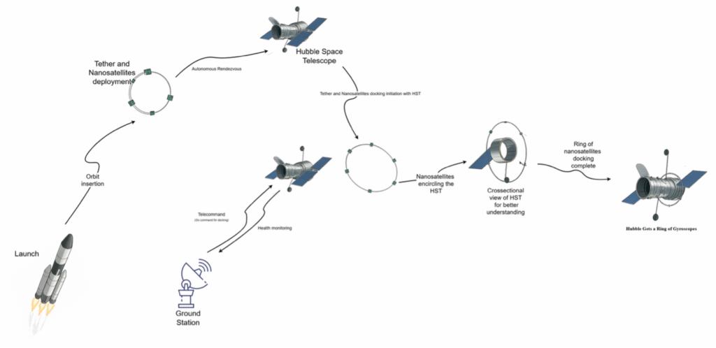 Our research team has created an economical and relatively simple solution to save Hubble and extend its operational life by at least two decades, although reaching the 2030s and beyond also depends on addressing orbital decay with a future reboost of the telescope’s altitude. Our concept is straightforward: Deploy four to six nanosatellites, each equipped with state-of-the-art gyroscopes as its primary payload, evenly spaced along a flexible tether that forms a ring with a slightly larger diameter than Hubble’s cylindrical body. The idea grew out of a discussion during Hubble’s 35th anniversary celebrations, when three researchers, passionate about cost-effective, low complexity solutions, began exploring non-intrusive ways to extend the life of a legacy observatory — especially as NASA’s deorbit studies and private reboost proposals highlighted both the risks and opportunities of intervening in Hubble’s future.